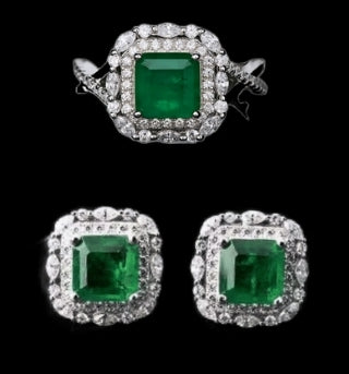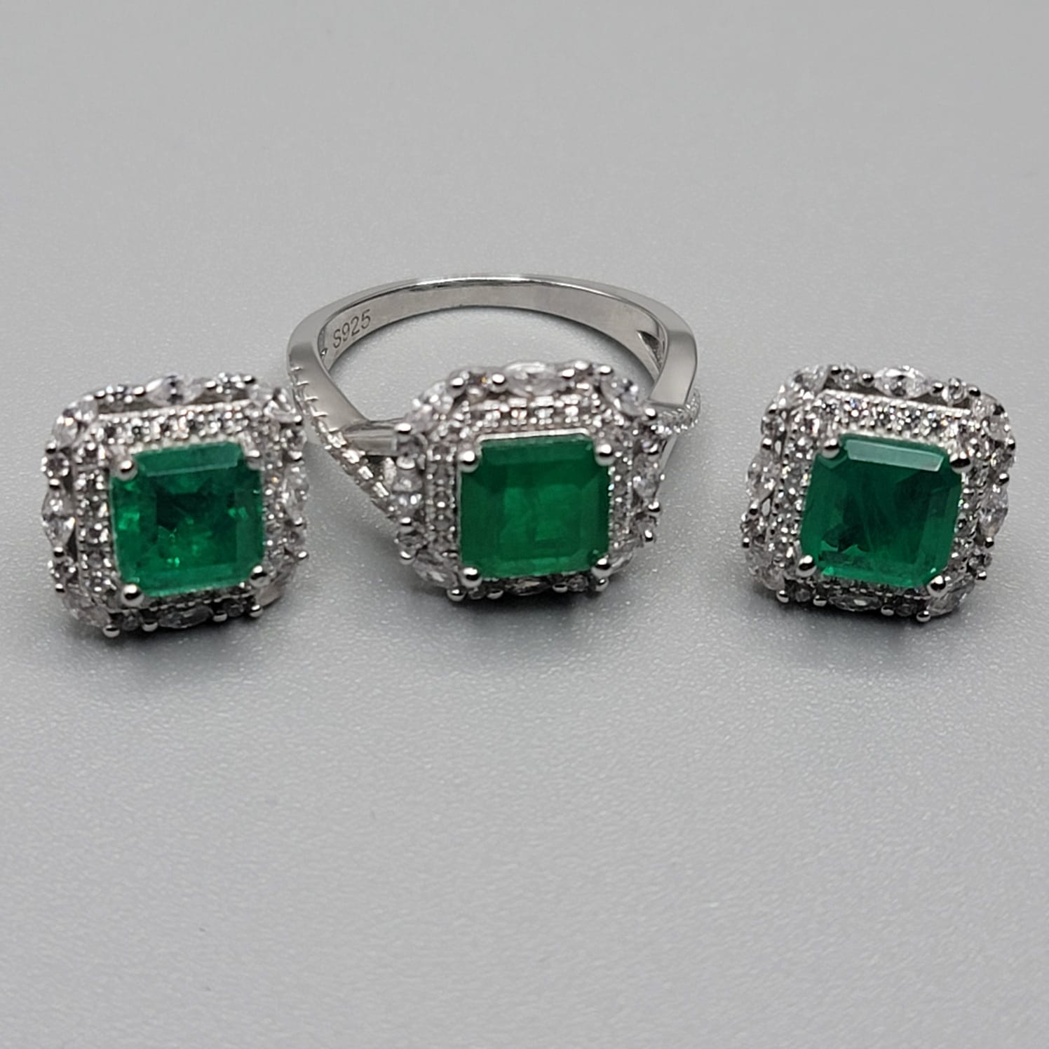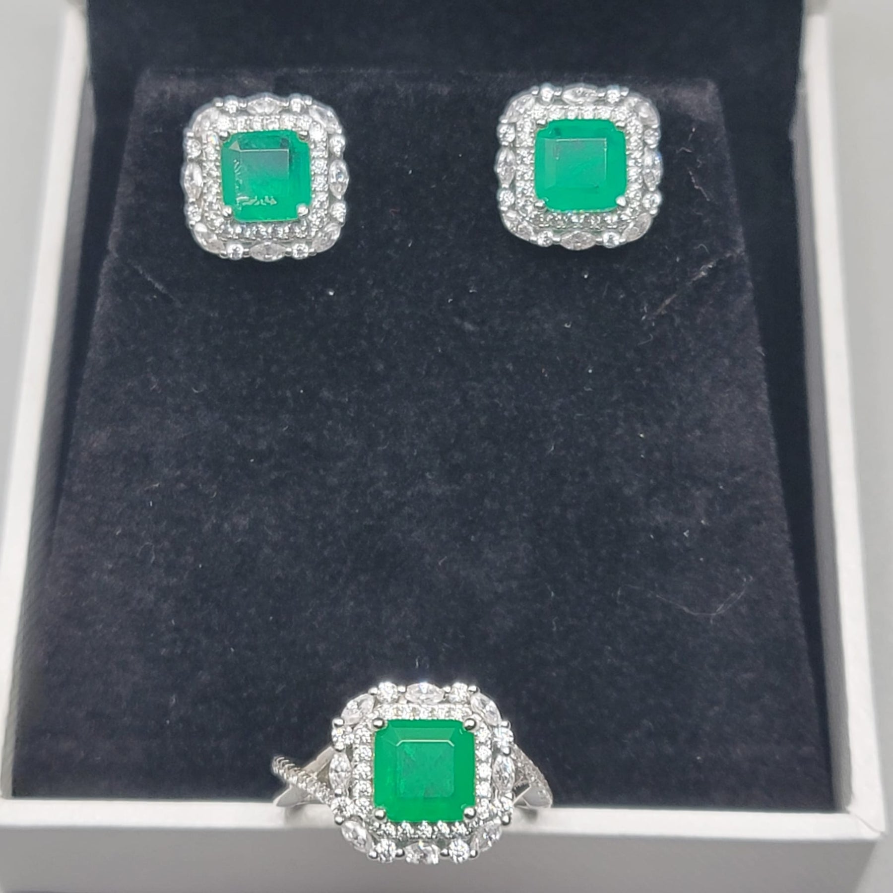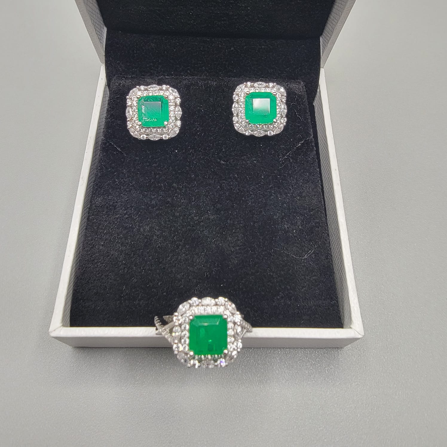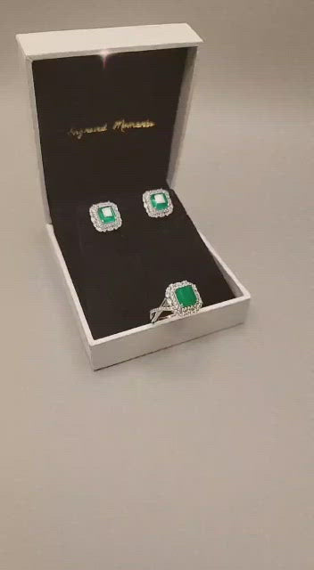Nestled in a sparkling diamond halo is a prong set Square emerald exuding its irresistible lush beauty. The split shank is encrusted with AAA Zirconia clusters, giving these emerald halo earrings and Ring a highly exquisite look.